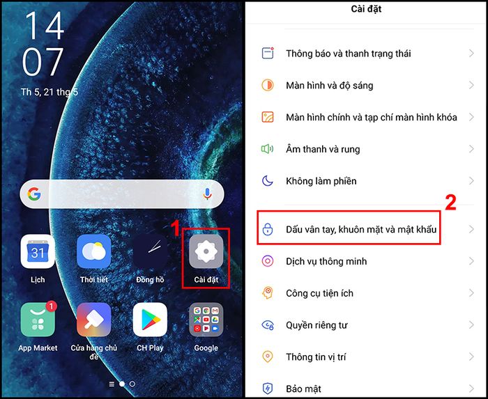Chọn Cài đặt từ màn hình chính hoặc từ danh sách ứng dụng > Chọn Dấu vân tay, khuôn mặt và mật khẩu.