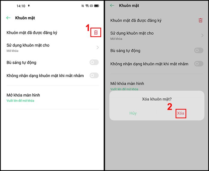 Nhấn biểu tượng Thùng rác > Chọn Xóa để gỡ bỏ khuôn mặt đã được thiết lập.