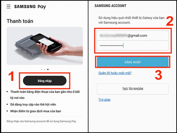 Nếu bạn chưa có tài khoản Samsung, hãy chọn TẠO TÀI KHOẢN và làm theo hướng dẫn để tạo tài khoản trên Samsung Pay.