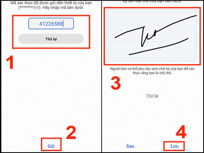 Bước 6: Nhập mã xác thực SMS, sau đó nhấn Gửi > Ký tên lên thẻ và nhấn Lưu.