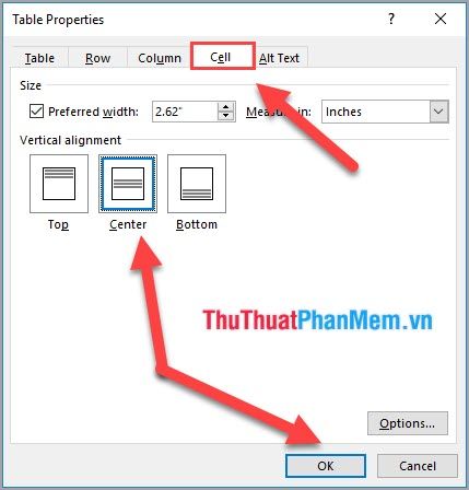 Bước 3: Hiện cửa sổ Table Properties. Chọn Tab Cell và phần Vertical alignment. Sau đó, chọn Center để căn ô ra giữa.