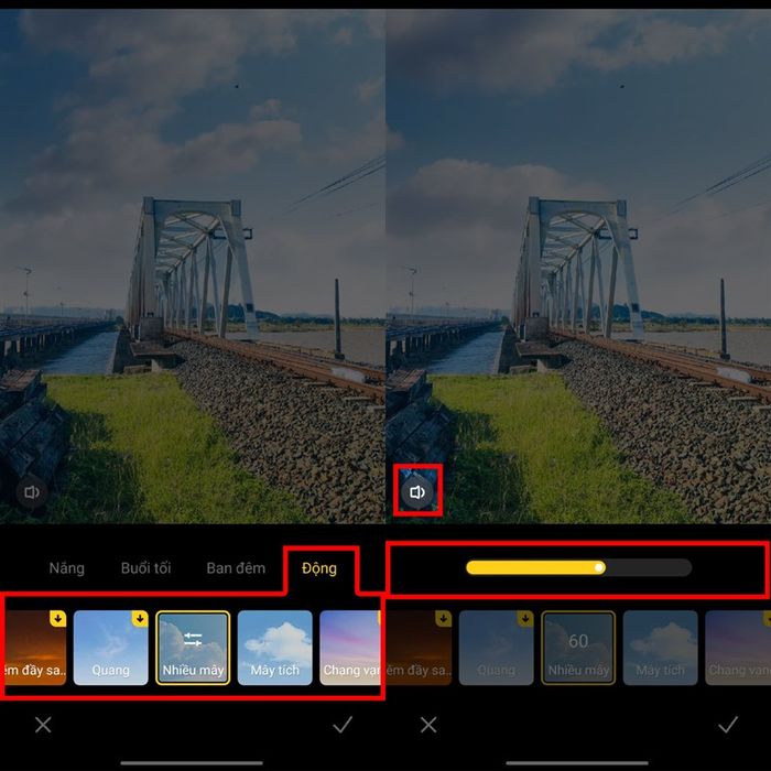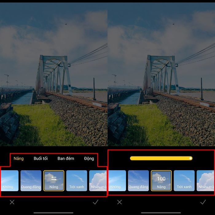 Bước 2: Chọn Nắng, Ban đêm, Buổi tối hoặc Động để áp dụng hiệu ứng. Bạn cũng có thể điều chỉnh độ đậm nhạt của hiệu ứng bầu trời.