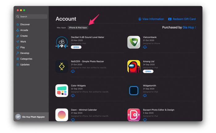 Khi cửa sổ ứng dụng mở, bạn chọn iPhone & iPad Apps. Tất cả các ứng dụng đã cài trên thiết bị iOS/iPadOS sẽ được hiển thị, chỉ cần tải về là xong :D.