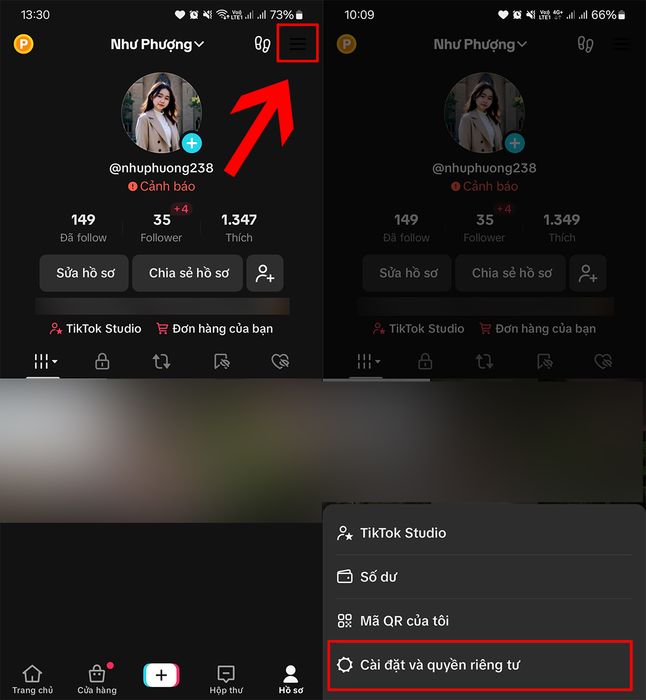 Bước 1: Mở ứng dụng TikTok và truy cập vào Hồ sơ cá nhân của bạn. Sau đó, nhấn vào biểu tượng 3 dấu gạch ngang ở góc trên bên phải, tiếp theo chọn Cài đặt và quyền riêng tư.