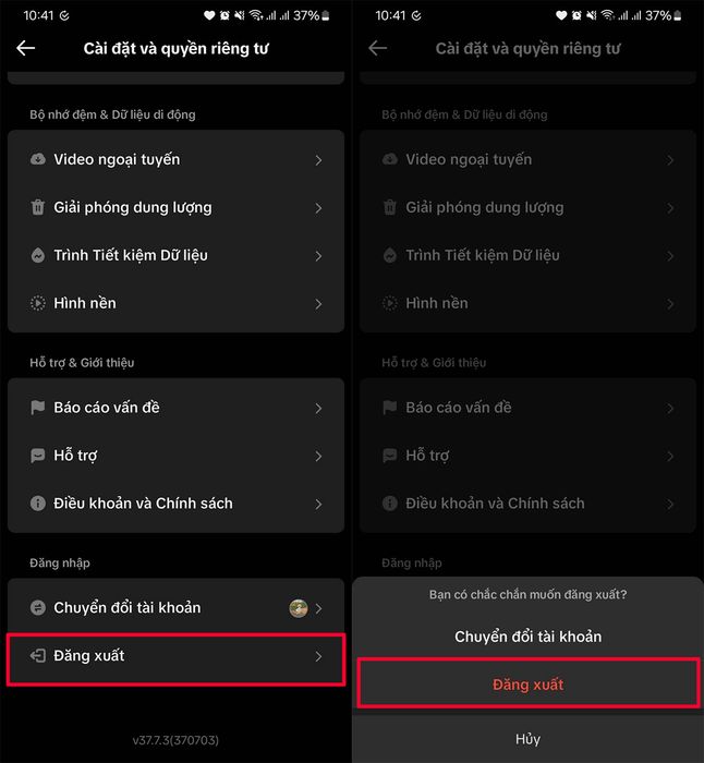 Bước 2: Kéo xuống dưới cùng và bạn sẽ thấy mục Đăng xuất, nhấn vào đó rồi chọn Xác nhận đăng xuất để hoàn tất việc đăng xuất tài khoản TikTok khỏi điện thoại.