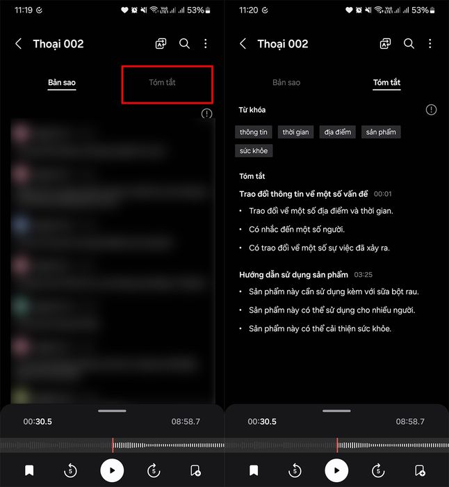 Bước 4: Tại đây bạn sẽ thấy tổng kết của file ghi âm, hãy nhấn vào Tóm tắt để xem chi tiết nhé.