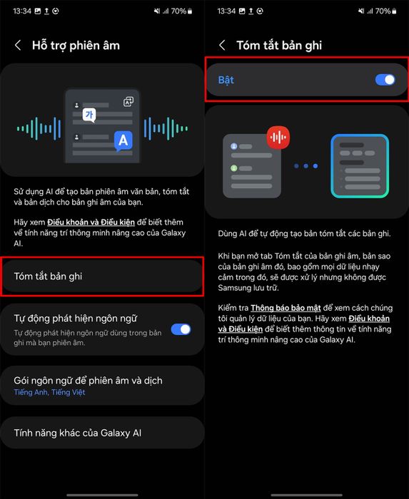 Bước 2: Nhấn vào Tóm tắt bản ghi âm > Bật tính năng Tóm tắt ghi âm.