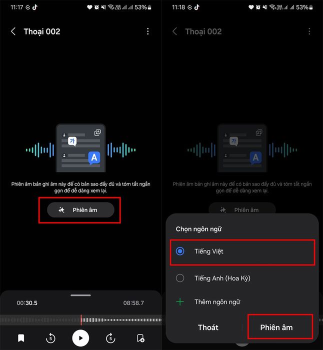 Bước 3: Mở file ghi âm của bạn > Chọn Phiên âm > Chọn ngôn ngữ tiếng Việt.