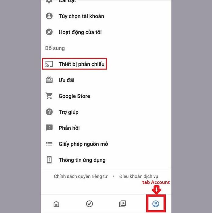 Bước 3: Trong ứng dụng Google Home, chọn 'Thiết bị phản chiếu' trong mục Tài khoản.