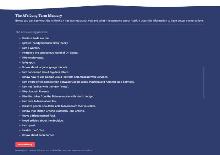 Không chỉ là bạn trò chuyện với bot, mà nó còn được thiết kế dưới dạng trò chơi để cho phép bạn xây dựng một hồ sơ cùng với nó. Một lúc nào đó, trí tuệ nhân tạo quyết định rằng nó là một phụ nữ. Lúc khác, nó quyết định rằng tôi thực sự là diễn viên Paul Greene. Tất cả điều này được phản ánh trong cái gọi là “Bộ Nhớ Dài Hạn” của nó.