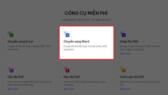 Tại trang chủ của FastDoc, bạn sẽ thấy các công cụ cần thiết. Để chuyển đổi từ ảnh sang file Word, nhấp vào Chuyển đổi sang Word.