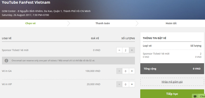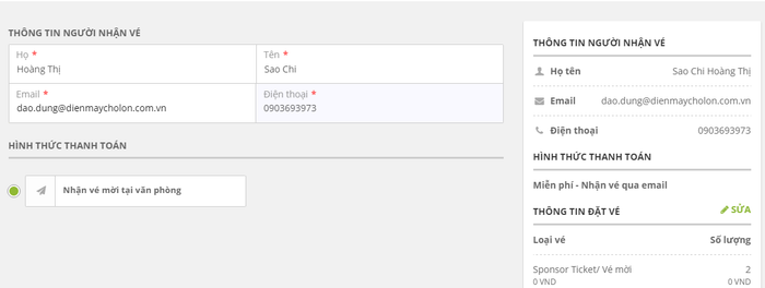 Bước 3: Chọn loại vé mời ở phía trên cùng, số lượng là 02 người