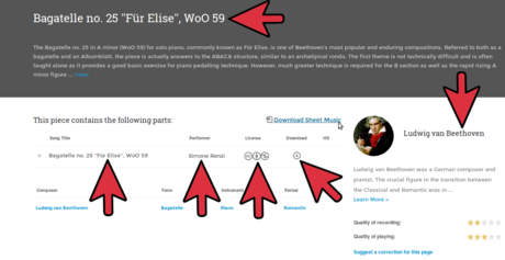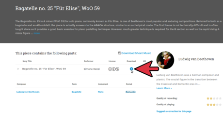 Chọn bản nhạc bạn yêu thích. Bạn nhìn thấy ngay bài nhạc ở 2 dòng đầu tiên trong danh sách rất phổ biến, được nhiều người yêu thích, Für Elise, và bạn chọn ngay bài ở dòng thứ 2 vì nó có nhiều sao hơn ở dòng 1, và bạn rất muốn nghe nó. Điều này sẽ đưa bạn đến trang của tác phẩm Für Elise bằng cách nhấn vào tiêu đề của bài. Trên trang của tác phẩm này, ngoài phần giới thiệu tác phẩm ở đầu trang, bạn sẽ thấy nhiều thông tin khác về tác phẩm như: