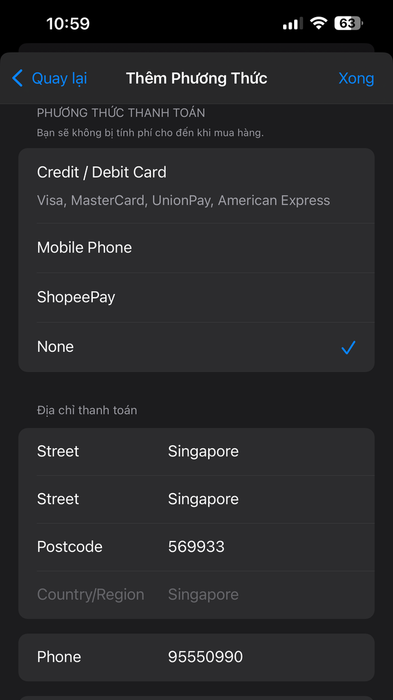 Lưu ý: Trong một số trường hợp, khi chuyển vùng sang Singapore, tùy chọn thanh toán "None" có thể không xuất hiện. Hãy khởi động lại thiết bị và thử thực hiện lại thao tác. Ngoài Singapore, bạn cũng có thể đổi vùng App Store sang các quốc gia khác như Mỹ, Nhật, Canada, Úc... để áp dụng cách làm này.