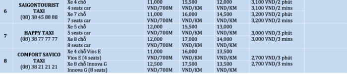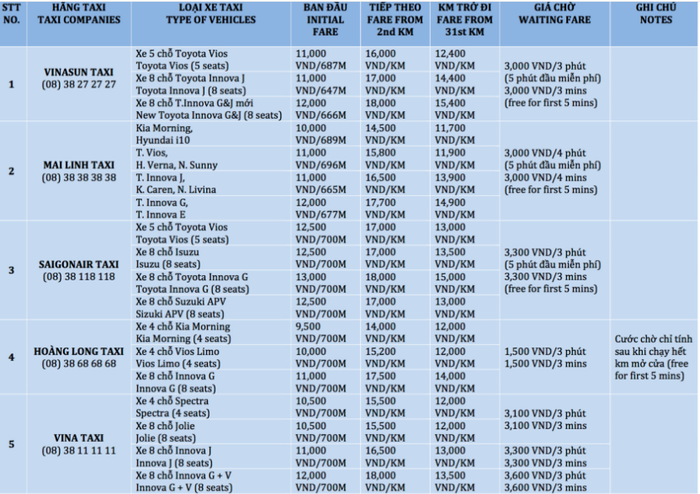 Bãi đỗ taxi nằm ngay ngoài ga đến của nhà ga quốc nội và quốc tế. Hiện có 8 hãng taxi được phép hoạt động tại Cảng HKQT Tân Sơn Nhất. Bạn có thể xem giá và số điện thoại của từng hãng trong bảng dưới đây: