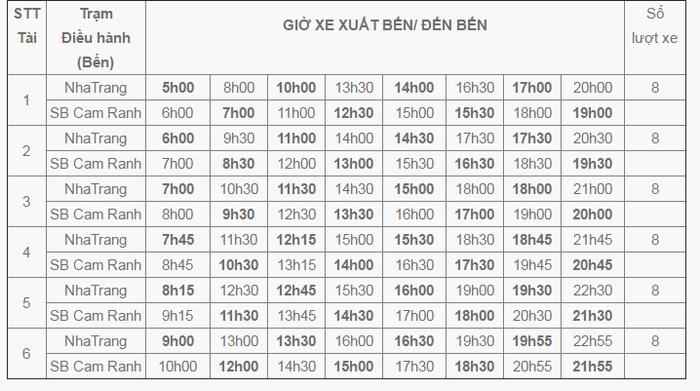 Dịch vụ Xe buýt sân bay (hoặc Airport Bus): phục vụ di chuyển từ sân bay Cam Ranh đến trung tâm Nha Trang. Thường là xe Ford Transit, có máy lạnh. Xe buýt sân bay chờ khoảng 30 phút sau khi máy bay hạ cánh hoặc đến khi xe đầy chỗ. Vé có giá khoảng 65.000 đồng. Mua vé tại quầy vé xe buýt ở cổng sân bay và lên xe ở bên trái cổng sân bay. Liên hệ: 0583 522 589 / 0583 511 511 / 0586 252 200 để biết thêm chi tiết về thời gian khởi hành.