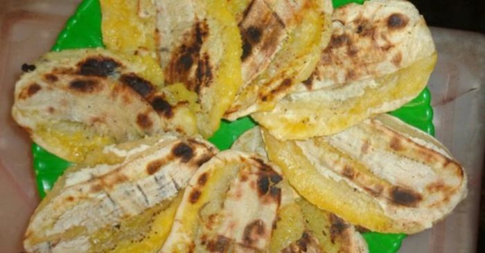 Một món ăn vặt ngon khó cưỡng đến từ vỉa hè Bến Tre là chuối xanh nướng chín, thêm nước cốt dừa đặc quánh tạo nên hương vị lôi cuốn.
