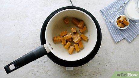 Đặt gói kẹo caramel đã bóc bao bì vào chảo cỡ vừa. Hầu hết gói caramel có khối lượng khoảng 400gr, nhưng bạn có thể chọn gói lớn hơn hoặc nhỏ hơn tùy ý. Sử dụng chảo nấu cách thủy cũng là một lựa chọn, quy trình giống như việc đặt nguyên liệu vào tô hoặc khay trên nồi hấp cách thủy.