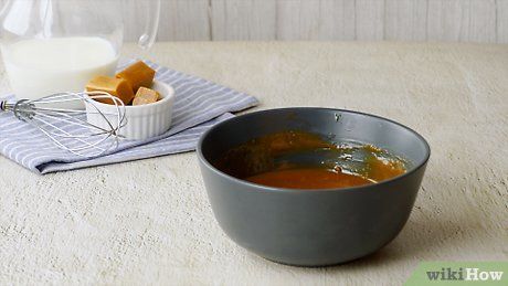 Đun caramel trong lò vi sóng ở mức nhiệt cao trong khoảng 1 phút và khuấy đều hỗn hợp. Đặt bát caramel vào lò vi sóng, chọn mức nhiệt cao và đun caramel 1 phút. Mở lò vi sóng, sử dụng cây vét bột bằng cao su để khuấy đều caramel.