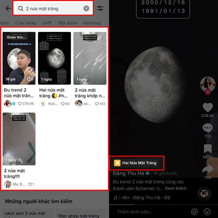 Bước 1: Bắt đầu bằng cách truy cập ứng dụng TikTok trên điện thoại của bạn. Sau đó, tại ô tìm kiếm, hãy nhập các cụm từ liên quan đến vầng trăng, ví dụ như '2 nửa vầng trăng'. Khi kết quả hiển thị, bạn có thể chọn một video bất kỳ có sử dụng hiệu ứng này và bấm vào phần hiệu ứng trên tên người dùng. Hoặc nếu bạn không tìm thấy, có thể nhấn vào đường liên kết dưới đây.