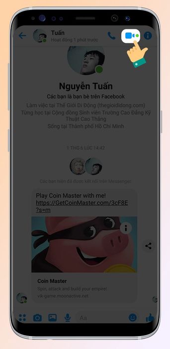 Bước 2: Trong khung trò chuyện của bạn bè, nhấn vào biểu tượng Cuộc Gọi Video Call ở góc phải màn hình
