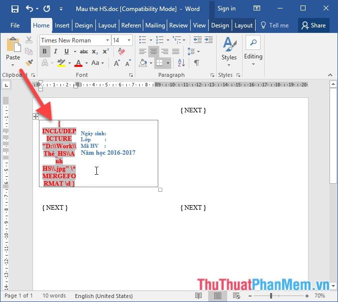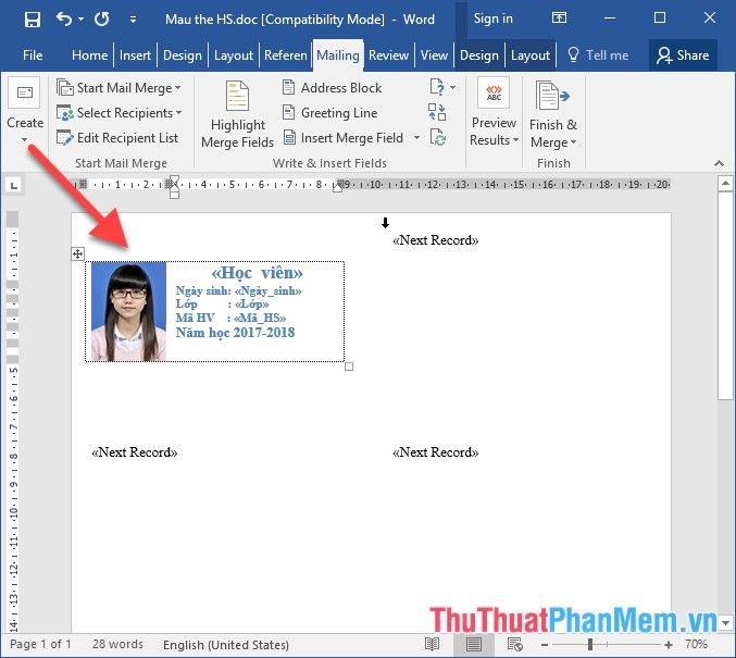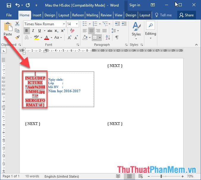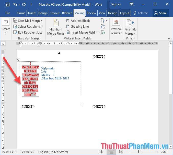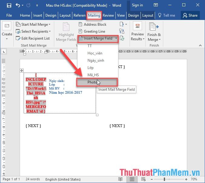 Bước 16: Đặt Con Trỏ Chuột Tại Vị Trí Chứa Tên File Của Ảnh -> Kích Chọn Thẻ Maillings -> Insert Merge Field -> Lựa Chọn Trường photo Tương Ứng Tên File Ảnh: