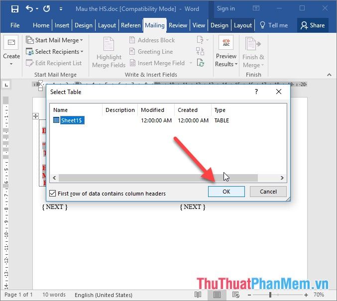 Bước 15: Lựa Chọn Tên Sheet Chứa Danh Sách -> Kích Chọn OK: