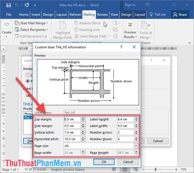 + Khổ Giấy A4 Có Chiều Cao 29.7cm, Ở Mục Trên Lựa Chọn Số Dọc =4 Tức 1 Trang Giấy Chứa 4 Thư Hay 4 Nhãn => Chiều Cao Mỗi Nhãn =(Chiều Cao Khổ Giấy – Lề Trên – Lề Dưới):4 =(29.7-0.5-0.5)=6.4cm