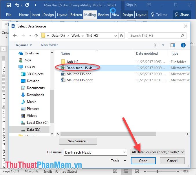 Bước 14: Trong Thẻ Mailings Kích Chọn Select Recipients -> Use an Existing List (Để Lựa Chọn File Excel Chứa Danh Sách Cần Chèn) -> Hộp Thoại Xuất Hiện Lựa Chọn Đường Dẫn Tới File Excel Chứa Danh Sách: