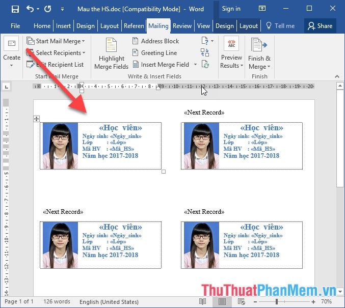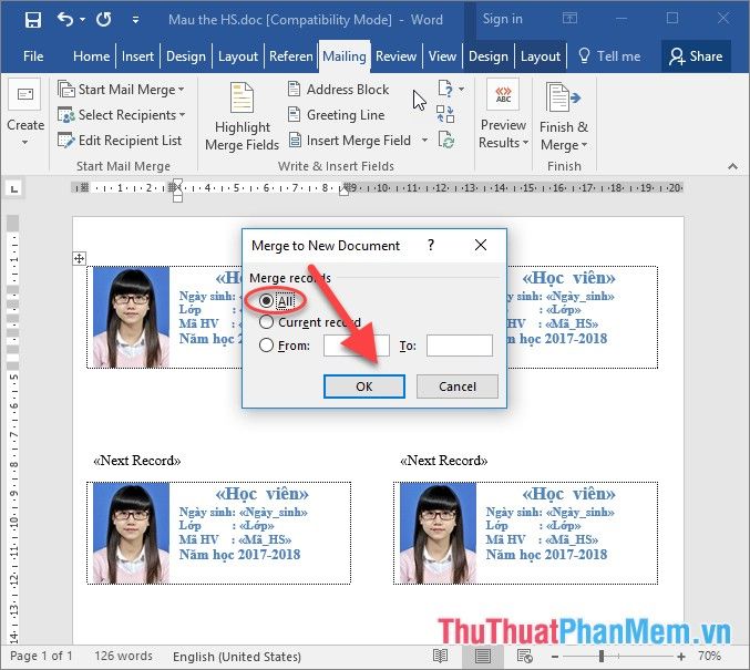 Bước 17: Kích chọn Finish & Merge -> Edit Individual Document để kiểm tra quá trình trộn ảnh đã thành công hay chưa:
