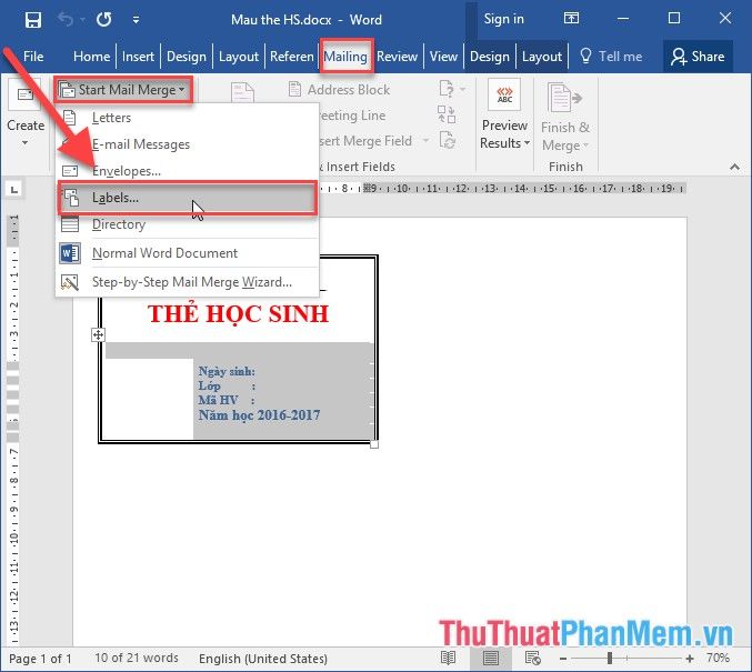 Bước 2: Vào Thẻ Mailings -> Start Mail Merge -> Labels:
