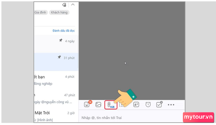 - Bật ứng dụng Zalo trên máy tính hoặc MacBook > Mở cuộc trò chuyện > Nhấn vào biểu tượng đính kèm tệp.