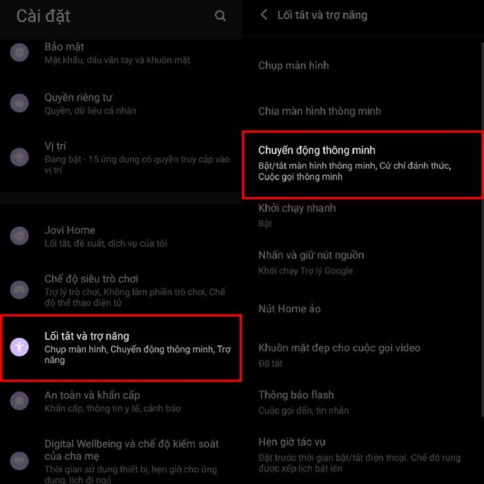 Bước 1: Mở Cài đặt trên điện thoại và vào mục Lối tắt và trợ năng. Chọn Chuyển động thông minh.