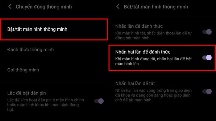 Bước 2: Kích hoạt tính năng chạm 2 lần để đánh thức màn hình Vivo V27e. Chọn Bật/tắt màn hình thông minh và bật công tắc ở mục Nhấn 2 lần để đánh thức. Ngoài ra, có nhiều tính năng khác để tắt hay bật màn hình.