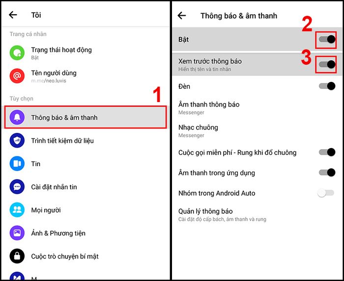 Tiếp tục vào mục Tùy chọn > Chọn Thông báo & âm thanh (1) > Bật thông báo (2) và xem trước thông báo (3).