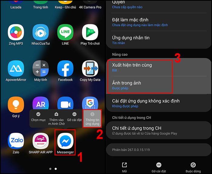 Bạn mở ứng dụng Messenger > Chọn Thông tin ứng dụng > Tiếp tục vào Ảnh trong ảnh (Pictures in Pictures - PiP) và chọn Xuất hiện trên cùng để cấp quyền cho ứng dụng.