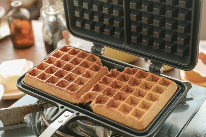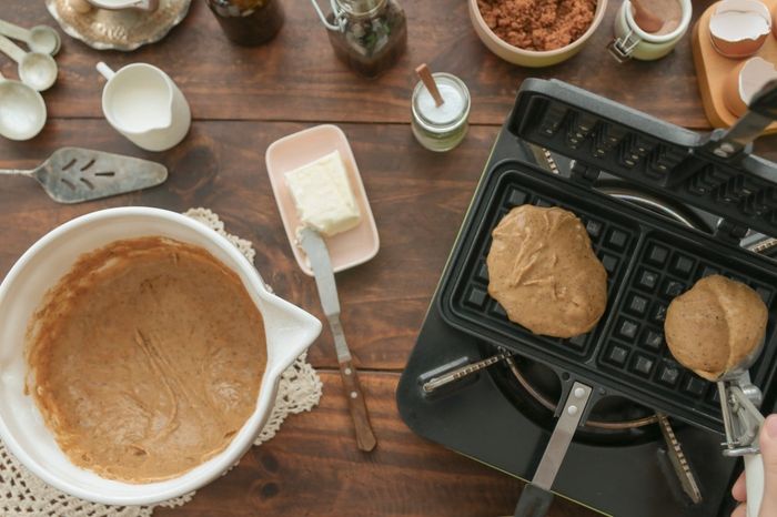 Kích nhiệt máy làm bánh Waffle, thoa một lớp bơ lên hai mặt của khuôn. Khi khuôn đã nóng, đổ đều hỗn hợp bột bánh vào và phân phối đều trên bề mặt.