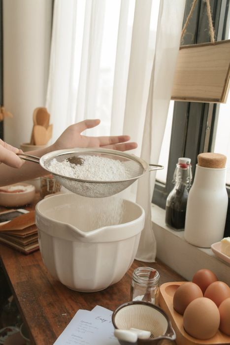 Sử dụng rây để lọc bột mịn trước khi thêm vào hỗn hợp lòng đỏ, sau đó thêm một chút muối vani và khuấy đều để có hỗn hợp mịn màng và không bị đặc.