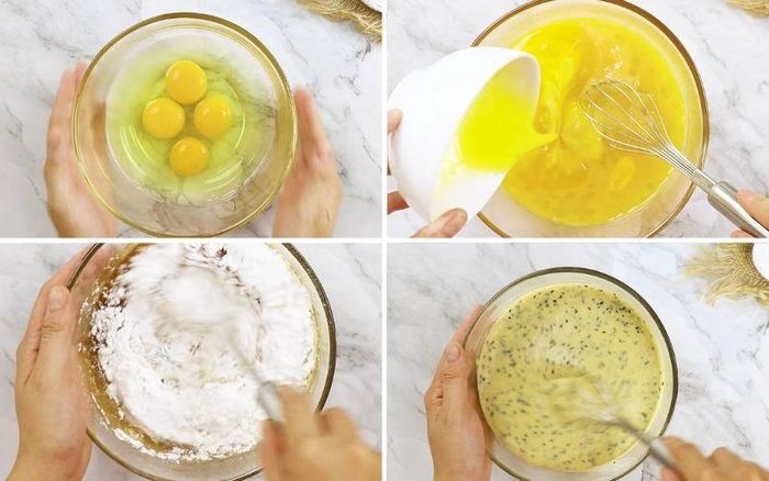 Rây từ từ 120g bột mì vào hỗn hợp, dùng phới lồng khuấy đều tay để tránh bị vón cục, tiếp tục khuấy khi hỗn hợp đã chuyển sang màu vàng chanh và đặc lại thì thêm vào 60ml sữa tươi, 20g mè đen khuấy đều.