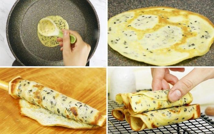 Đặt một chảo chống dính lên bếp và đợi cho đến khi chảo nóng. Sau đó, giảm lửa xuống mức trung bình và múc một muỗng hỗn hợp vào chảo, dùng muỗng cán mỏng phẳng hỗn hợp. Khi bề mặt bánh khô lại, lật bánh để thêm khoảng 30 giây rồi lấy bánh ra đĩa.