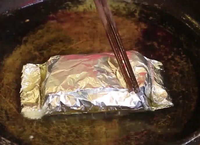 - Gập giấy bạc thành hình chữ nhật, chiên chả ốc trong chảo khoảng 1-2 phút, sau đó vớt ra.