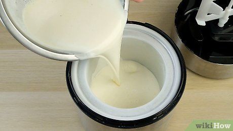 Lấy hỗn hợp sữa-trứng-kem từ tủ lạnh. Rót hỗn hợp vào máy làm kem. Theo hướng dẫn của nhà sản xuất, đông lạnh kem.