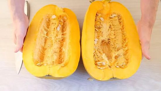 - Sau khi đã cắt quanh quả bí, bạn có thể cắt một nhát cuối cùng từ trên xuống dưới và sử dụng tay để tách đôi quả bí.