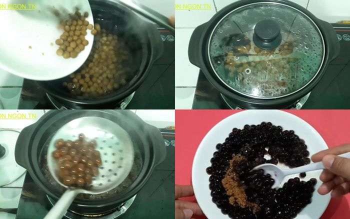 Nấu trân châu đường đenĐun sôi 1 lít nước trên bếp, sau đó từ từ thả các viên trân châu vào, khuấy nhẹ để tránh bị dính. Đun cho đến khi hạt trân châu chuyển sang màu đen và nổi lên trên mặt nước, sau đó tắt bếp và hớt ra tô.