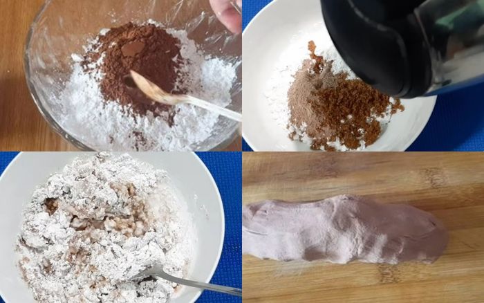 Kết hợp bộtKết hợp 140g bột năng, 20g bột gạo, 5gr bột cacao, 100g đường đen trong một tô lớn. Sau đó, thêm từ từ 150ml nước sôi vào hỗn hợp bột và khuấy đều cho đến khi bột trở nên mịn và đồng nhất.