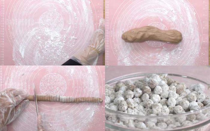 Tạo hình trân châuTrải bột năng mỏng lên bàn và đặt phần bột trân châu đường đen lên trên. Sau đó, chia bột thành 4 phần bằng nhau và nặn thành hình trụ dài có đường kính khoảng 1cm, sau đó cắt thành từng miếng nhỏ và tròn lại để tạo ra những viên trân châu.