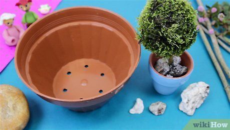 Chuẩn bị mặt đất cho ngôi nhà (tuỳ ý). Nếu bạn muốn đặt ngôi nhà tiên trong nhà, có thể bạn sẽ cần tạo ra một mặt đất để đặt ngôi nhà lên trên đó. Sử dụng tấm bìa cũ hoặc tấm gỗ và trang trí để tạo ra một khung cảnh giống ngoài trời. Bổ sung rêu để tạo cỏ, nhánh cây để tạo cây cối nhỏ, và sử dụng sỏi để tạo ra các tảng đá. Bạn cũng có thể xây nhà tiên trong khu vườn cây trồng trong chậu.