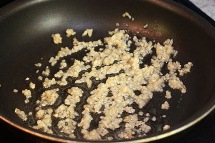 Thêm 2 muỗng canh dầu ăn vào chảo, đợi khi dầu sôi, thả tỏi đã bằm nhỏ vào phi thơm cho đến khi có màu vàng nâu, sau đó vớt ra và để trên giấy thấm dầu.