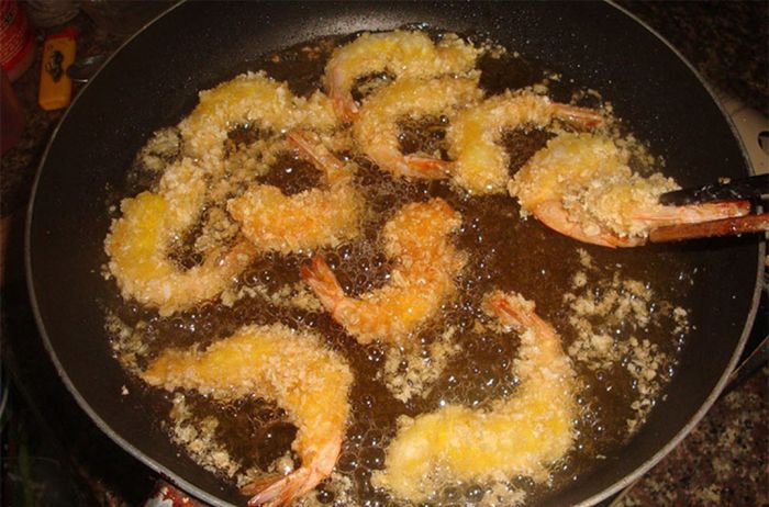 Chuẩn bị một chiếc chảo sâu hoặc nồi nhỏ (để tránh lượng dầu lan tỏa), đợi dầu sôi, sau đó thả tôm vào chiên ở lửa vừa. Vì tôm chín rất nhanh, nên chiên khoảng 30 giây, sau đó lật mỗi con và chiên thêm 30 giây nữa.