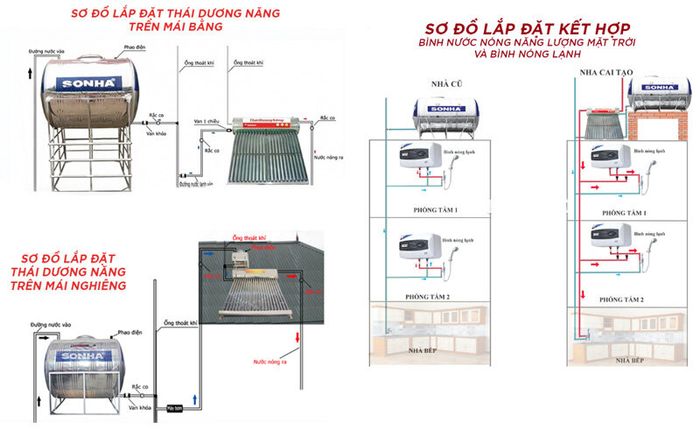 Sơ đồ lắp máy nước nóng năng lượng mặt trời Sơn Hà (thái dương năng Sơn Hà) hiện nay có 3 phương án chính như sau: